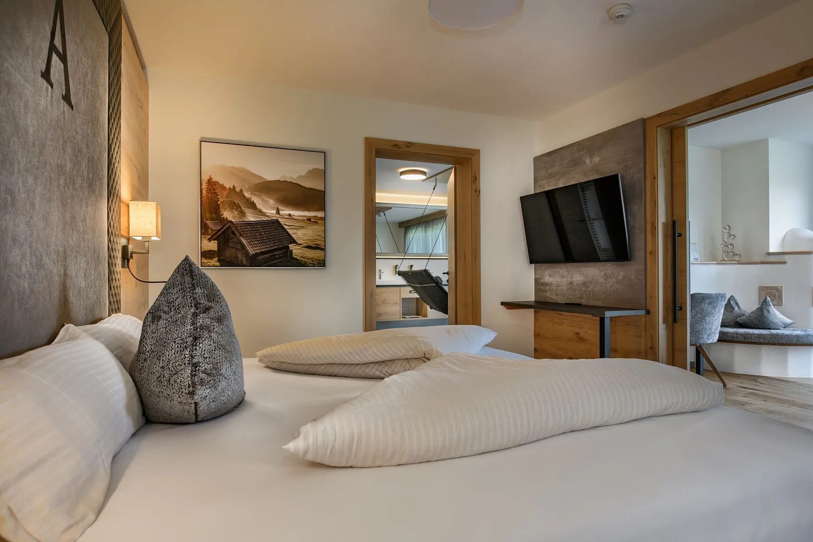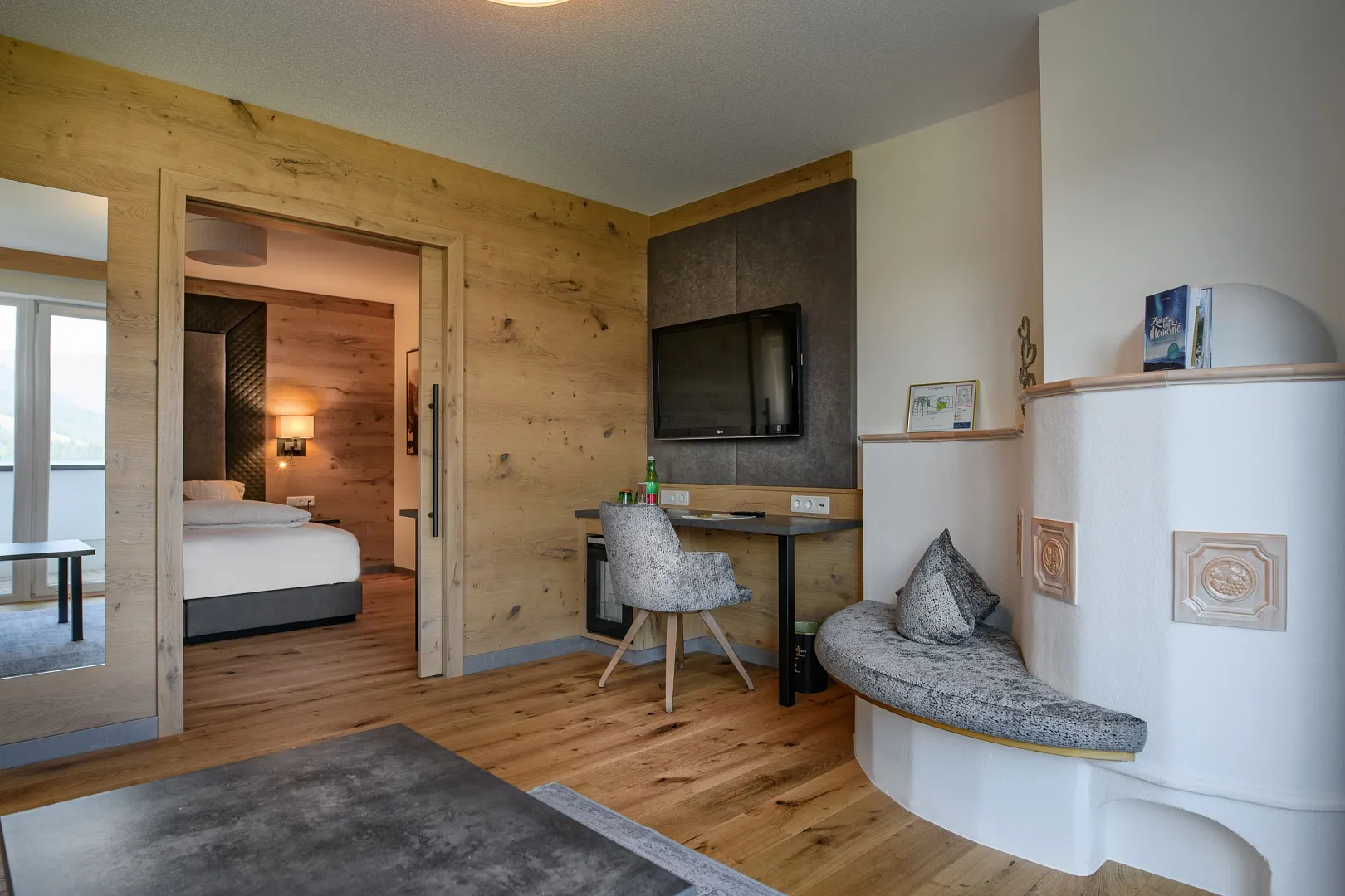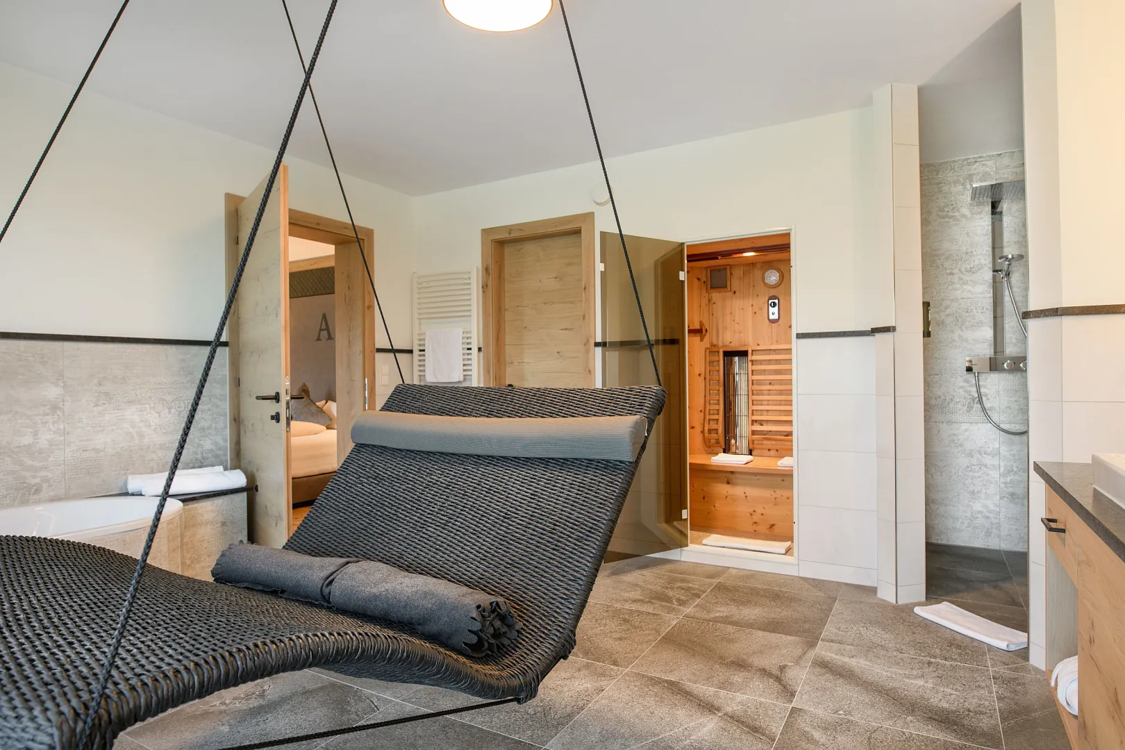 Die NEU RENOVIERTE Suite Honeymoon im alpinen Chalet Stil mit Eichenholzboden ist 55m² groß und liegt im 3. Stock mit seperatem Zugang über die Dachterrasse. Schlafzimmer mit kuscheligem Boxspringbett, abgetrenntes Wohnzimmer mit Ausziehcouch, Kachelofen und Panoramablick. 2 TV, Badezimmer mit Doppelwaschbecken, Badewanne und große bodengleiche Dusche, Infrarotkabine und Schwebe-Hängeliege mit Panoramablick, WC seperat, private Südterrasse mit kuscheliger Doppelruheliege, Tiefgaragenparkplatz, Bademantel, Haarfön, Minibar (ungefüllt), Radio, Telefon, W-LAN, Kosmetikspiegel, Nichtraucher, Safe.