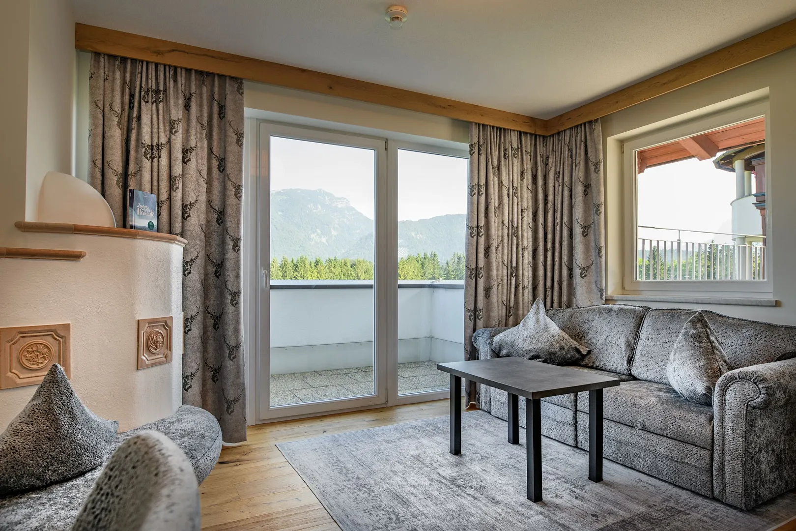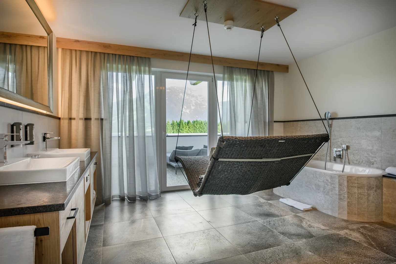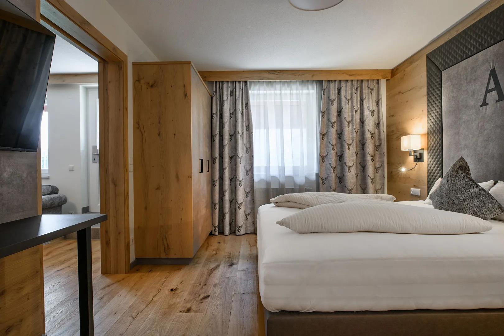 Die NEU RENOVIERTE Suite Honeymoon im alpinen Chalet Stil mit Eichenholzboden ist 55m² groß und liegt im 3. Stock mit seperatem Zugang über die Dachterrasse. Schlafzimmer mit kuscheligem Boxspringbett, abgetrenntes Wohnzimmer mit Ausziehcouch, Kachelofen und Panoramablick. 2 TV, Badezimmer mit Doppelwaschbecken, Badewanne und große bodengleiche Dusche, Infrarotkabine und Schwebe-Hängeliege mit Panoramablick, WC seperat, private Südterrasse mit kuscheliger Doppelruheliege, Tiefgaragenparkplatz, Bademantel, Haarfön, Minibar (ungefüllt), Radio, Telefon, W-LAN, Kosmetikspiegel, Nichtraucher, Safe.